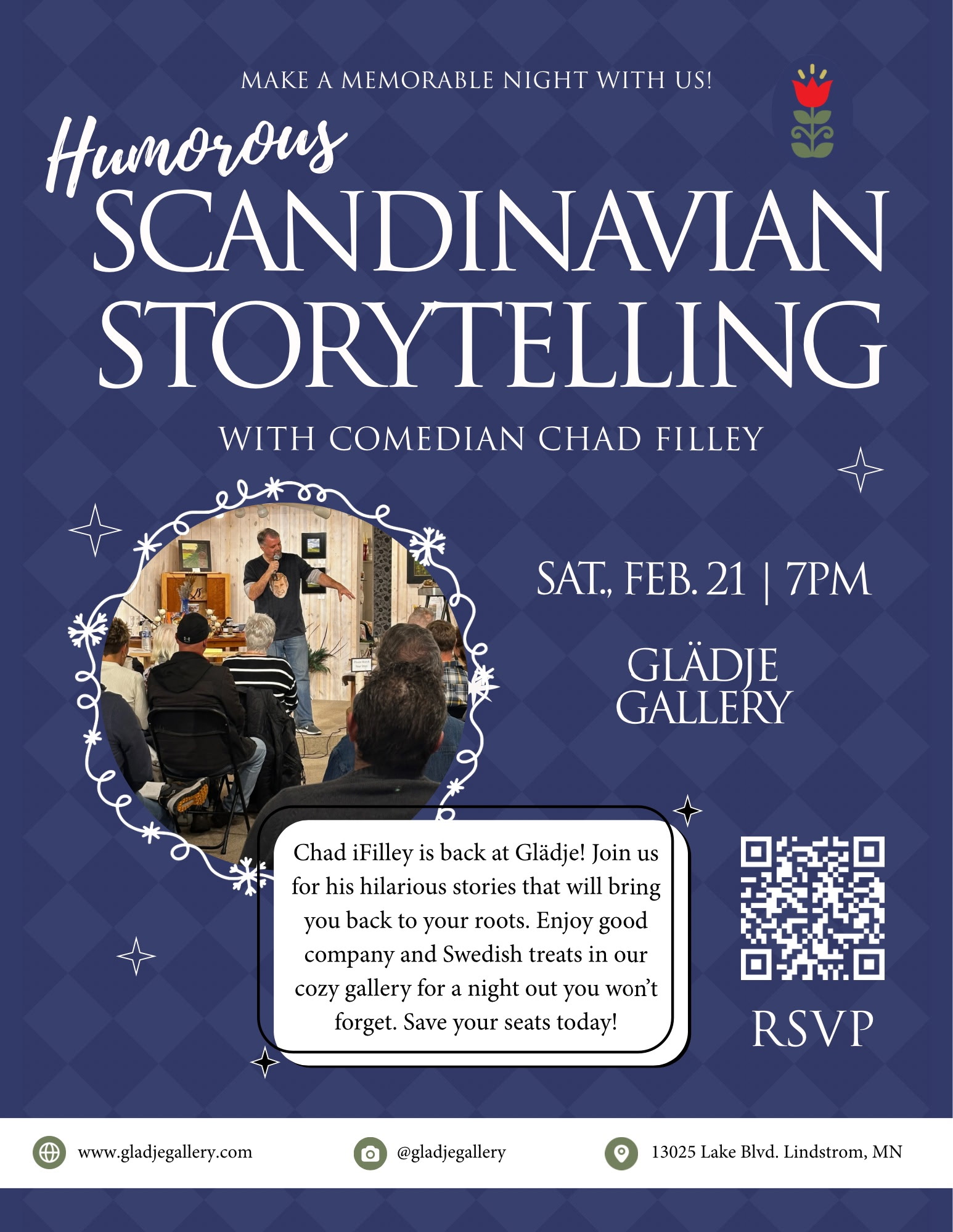 Chad Filley is back at Gladje!  Join us for his hilarious stories that will bring you back to your roots.  Enjoy good company and Swedish treats in our cozy gallery for a night out you won’t forget.  Save your seats today!